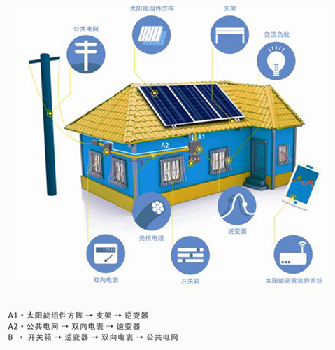 分布式光伏發(fā)電系統(tǒng),一般是建在工業(yè)廠房、商業(yè)建筑、農(nóng)業(yè)設(shè)施、市政公共建筑、民用建筑等滿足荷載要求的混凝土、彩鋼板和瓦片式屋頂以及邊遠(yuǎn)農(nóng)牧區(qū)、海島等少電無電地區(qū)。該類項(xiàng)目可以接入公共電網(wǎng),與公共電網(wǎng)一起為附近的用戶供電。分布式光伏發(fā)電遵循因地制宜、清潔高效、分散布局、就近利用的原則,充分利用當(dāng)?shù)靥?yáng)能資源,替代和減少化石能源消費(fèi)。 戶用分布式光伏系統(tǒng)主要由光伏組件、支架、逆變器及監(jiān)控系統(tǒng)等組成,安裝在居民區(qū)屋頂,發(fā)電量自發(fā)自用、余電上網(wǎng)。