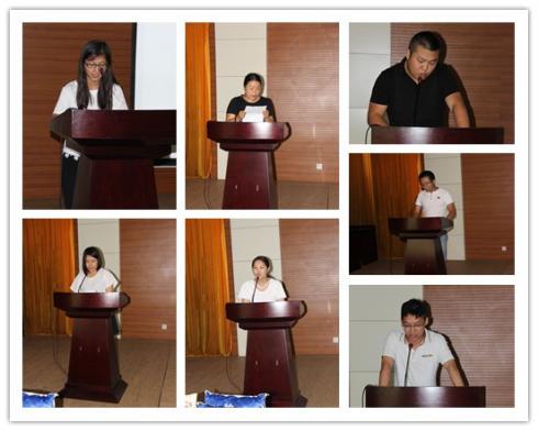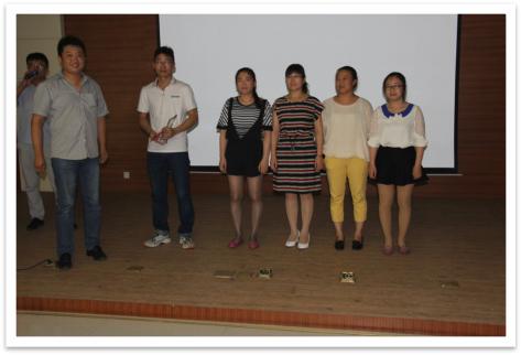 圖一:活動(dòng)現(xiàn)場(chǎng)評(píng)委亮相 (運(yùn)營(yíng)總經(jīng)理王波女士、電池片車間主任王磊先生、 組件一車間主任李鳳女士、組件二車間主任徐錦先生、人力資源部經(jīng)理金鈴霖女士)